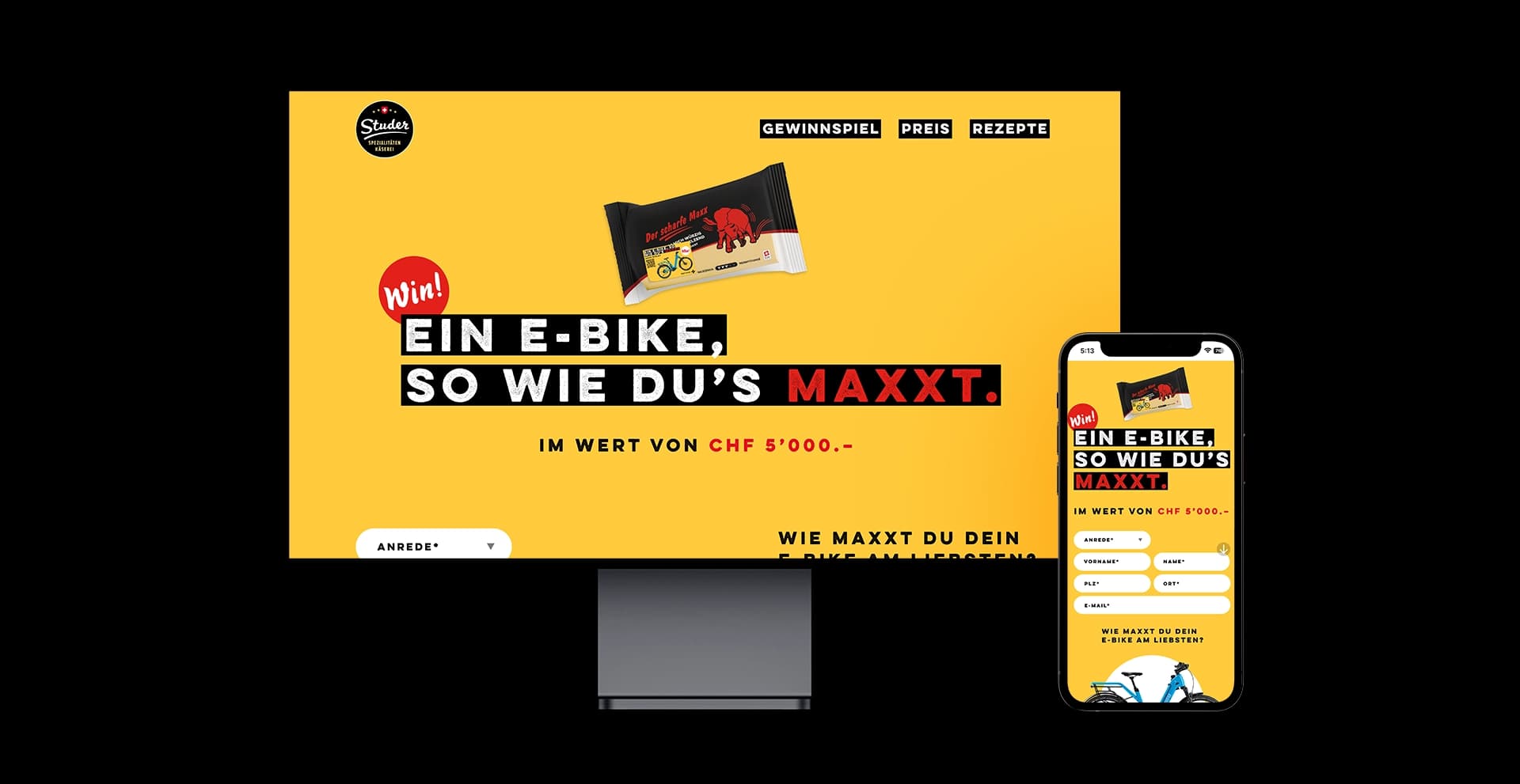 For our client Käserei Studer and their popular product “Scharfer Maxx” we developed a customized microsite in collaboration with Inhalt und Form as part of a price draw campaign. The primary goal was to generate leads. By integrating Mailchimp directly, the email addresses of prize draw participants were collected in the email marketing software for future campaigns. The leads were not generated online but at the Point of Sale (POS). Thanks to UTM tracking, the source of each lead could be measured and analyzed to optimize the effectiveness of various touchpoints.